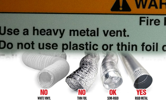Most dryers have a warning label that states not to use thin foil or plastic hose, yet we see so many homes using it! We replace the wrong dryer hose with either solid ductwork or semi-rigid and always test the dryer for safety.